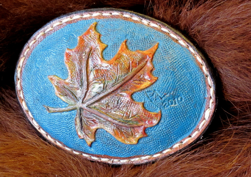 Lederbuckle handpunziert. Maße: 10 x 7 cm.