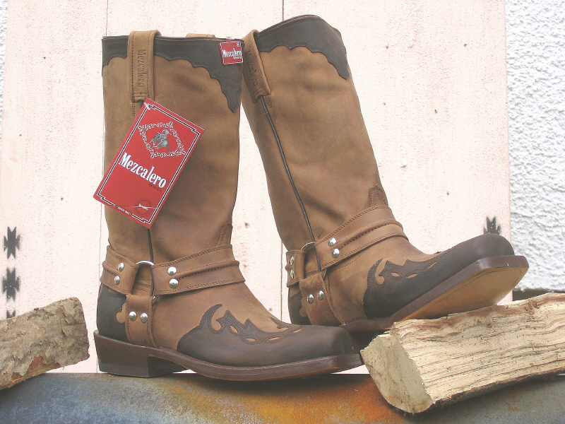 Stiefel Mezcalero 9019 CH. Klassischer brauner Bikerstiefel mit Applikationen.