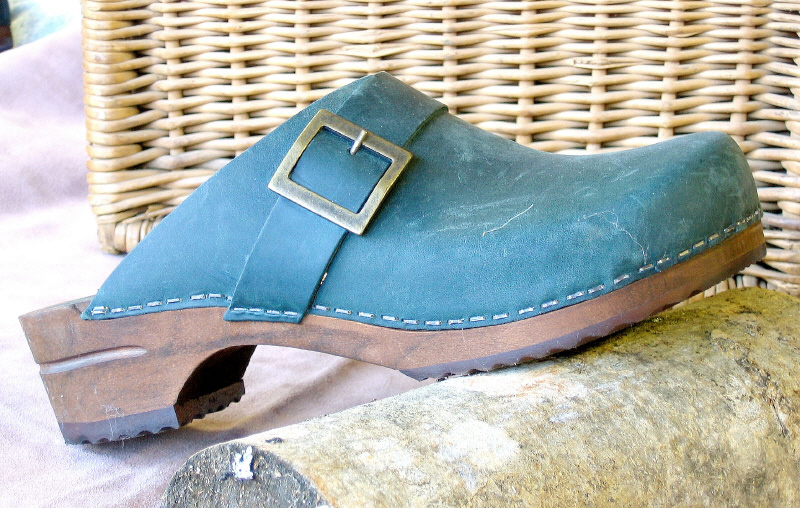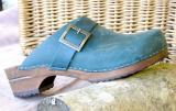 Holz-Clogs aus gefettetem Rindsleder mit schöner Messingschnalle. Farbe: Petrol ( dunkles Grün). In den Größen: 36, 37, 39 + 41.