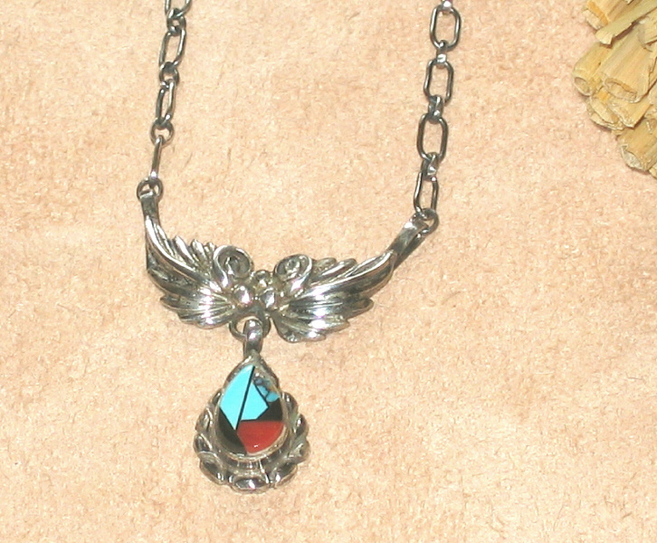 mit Einlegearbeiten in Türkis und Koralle, Anhänger ca. 3 cm breit und 2,8 cm lang. Gesamtlänge offen: 55 cm.