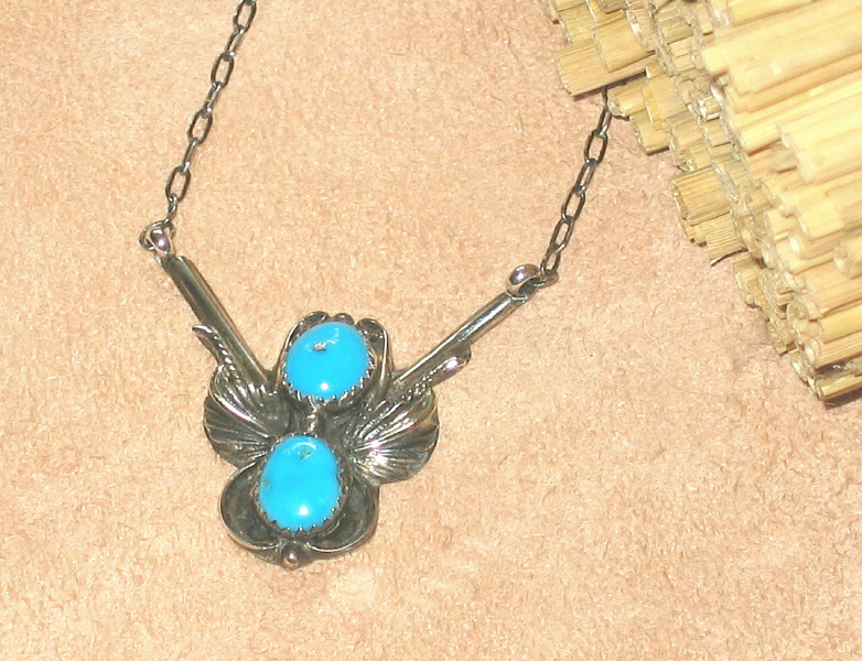 mit 2 Türkisen, Anhänger ca. 4 cm breit und 3,5 cm lang. Gesamtlänge offen: 48 cm.
