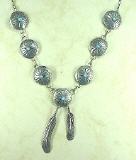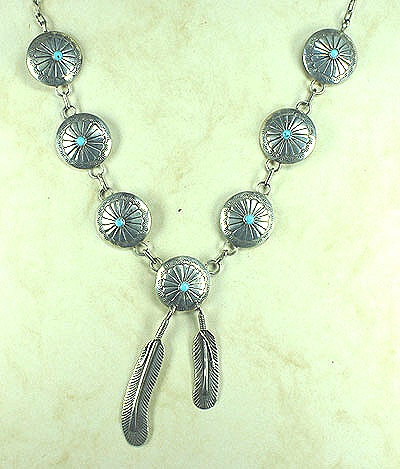 handgearbeitet, mit 7 Türkisen in Silber gefasst, Durchmesser der Silberscheiben ca. 2 cm. Gesamtlänge offen: 57 cm.