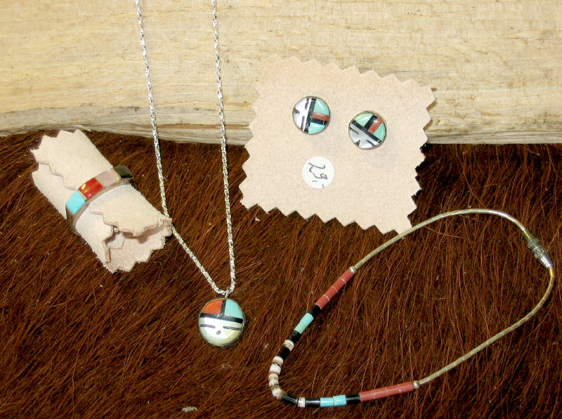 ( Zuni) mit Anhänger, Silberkette, Ring und Armbändchen. Armband bis Armumfang von ca. 16,5 cm, mögliche Größen des Rings von 5-7, Ohrstecker Durchmesser ca.9mm.