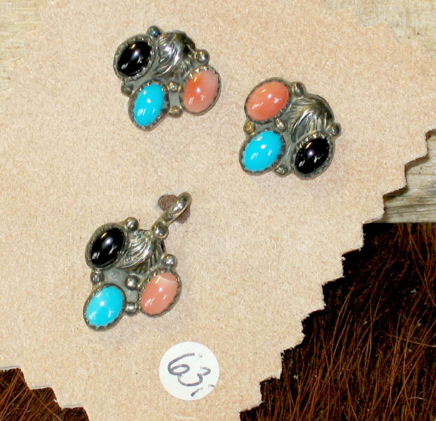 mit Anhänger ( ohne Silberkette). Ohringe als Stecker. ( Onyx, Türkis und Koralle). Maße der Ohrstecker: ca. 1,5 x 1,3 cm.