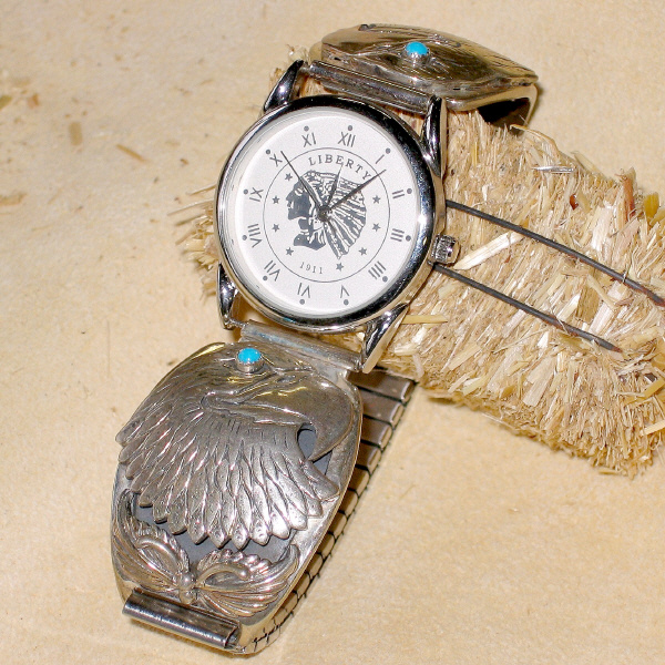 mit 2 Türkisen, römische Ziffern, Durchmesser des Zifferblattes ca. 3 cm, für mittleres bis starkes Handgelenk. Armband dehnbar. Es können Armbandglieder je nach Größe eingesetzt werden.