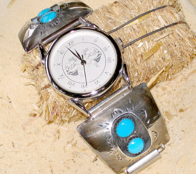 mit vier Türkisen, römische Ziffern, Durchmesser des Zifferblattes ca. 3 cm, für mittleres bis starkes Handgelenk. Armband dehnbar. Es können Armbandglieder je nach Größe eingesetzt werden.