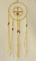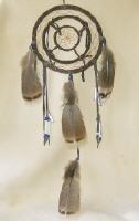 Nach einer alten Überlieferung des Ojibwa-Stammes, soll der Traumfänger über die Schlafstätte gehängt werden. In dem Netz werden die Träume gefangen, die guten Träume gehen über die nach unten hägenden Fetische auf den Schläfer über; die schlechten hingegen werden mit dem ersten Morgenlicht abgeleitet. ( Echt Leder und Echtfell)