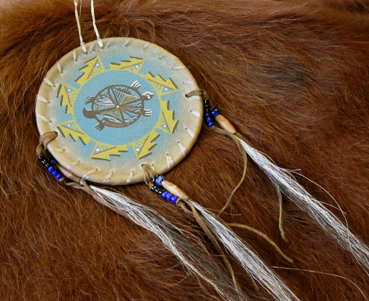 aus Rohhaut, handbemalt, mit kleinen Glasperlen, ca. 10 cm Durchmesser