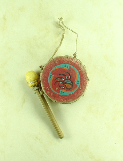 Trommelkörper aus massivem Holz, mit Rohhaut überspannt, handbemalt, Durchmesser ca. 4,5 cm