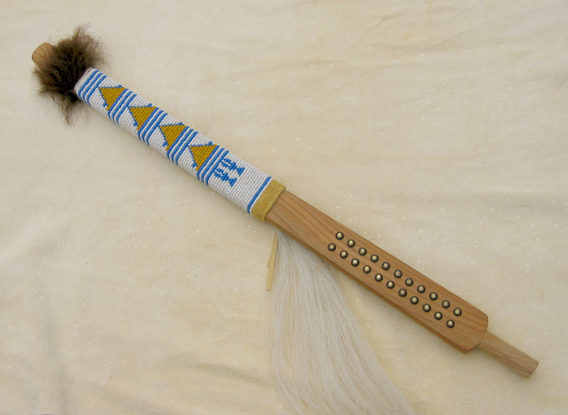 aus Holz mit Perlenarbeiten verziert, Bisonfell und Pferdehaar, Länge ca. 68 cm x mittlere Breite ca. 4 cm x Höhe ca. 2 cm