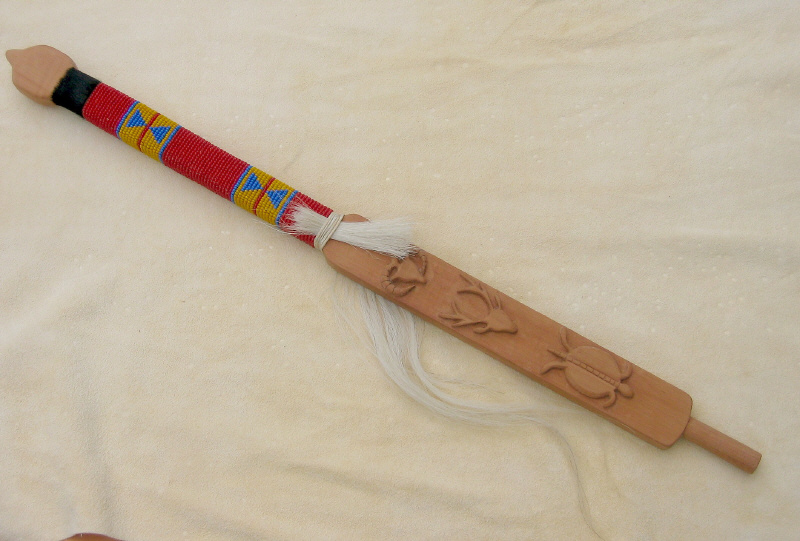 aus Holz mit Tiermotiven und mit Perlenarbeiten verziert, Pferdehaar, Länge ca. 74,5 cm x mittlere Breite ca. 4,5 cm x Höhe ca. 2 cm