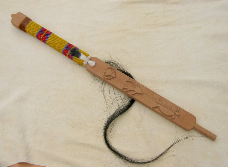 aus Holz mit Tiermotiven und mit Perlenarbeiten verziert, Pferdehaar, Länge ca. 75 cm x mittlere Breite ca. 4,5 cm x Höhe ca. 2 cm