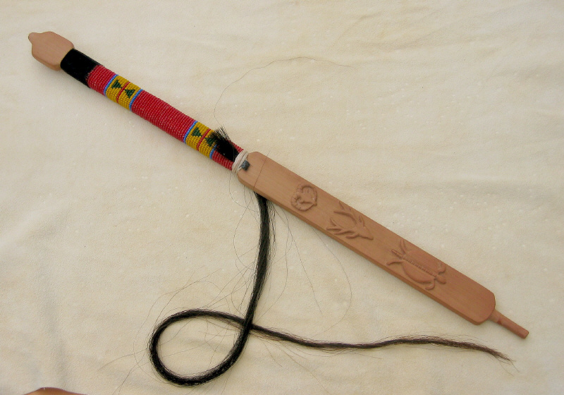 aus Holz mit Tiermotiven und mit Perlenarbeiten verziert, Pferdehaar, Länge ca. 73 cm x mittlere Breite ca. 4 cm x Höhe ca. 2 cm