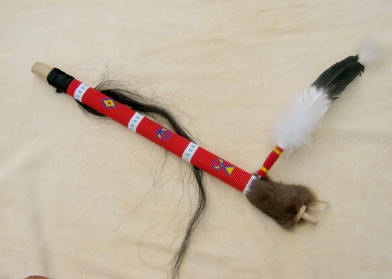 aus Holz mit Perlenarbeiten verziert, Pferdehaar und Adlerimitationsfeder, Länge ca. 56 cm x mittlere Breite ca. 3 cm x Höhe ca. 2 cm