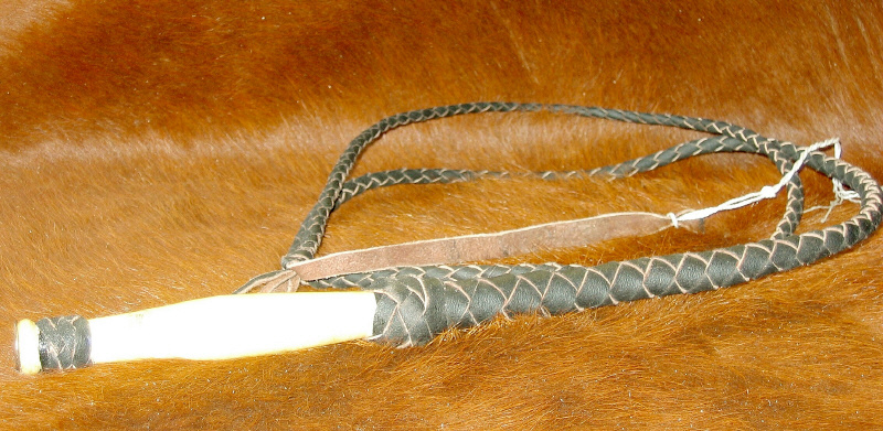 aus Leder geflochten, mit Holzgriff. Ca. 1,90m lang. Sehr dekorativ.