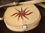 Tasche Trapperstil Sonne aus eigener Herstellung. Aus robustem Rindsleder und alles handvernäht mit Kunstsehne. Schulterriemen. Maße: ca. 26 cm an breitester Stelle, 22 cm hoch und 5,5 cm tief. 135,00 EUR