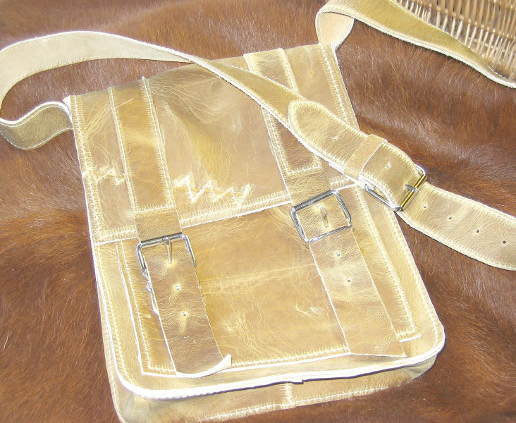 aus natürlichem Rindsleder, hergestellt in eigener Werkstatt, 1 Innenfach - perfekt auch für DinA4- Größen, 1 Außenfach, verschließbar durch 2 Rollschnallen und Schulterriemen verstellbar. Maße: (BxHxT) ca. 23,5 x 34 x 5 cm.