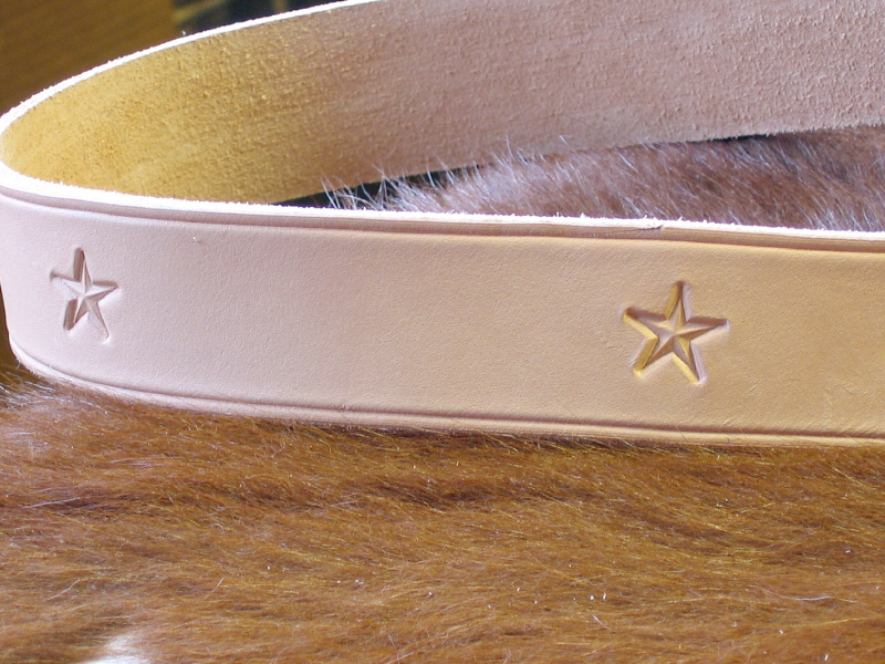naturfarben mit Sternen verziert, gezogener Kante und silberfarbener Rollschnalle. Breite 4 cm.