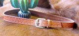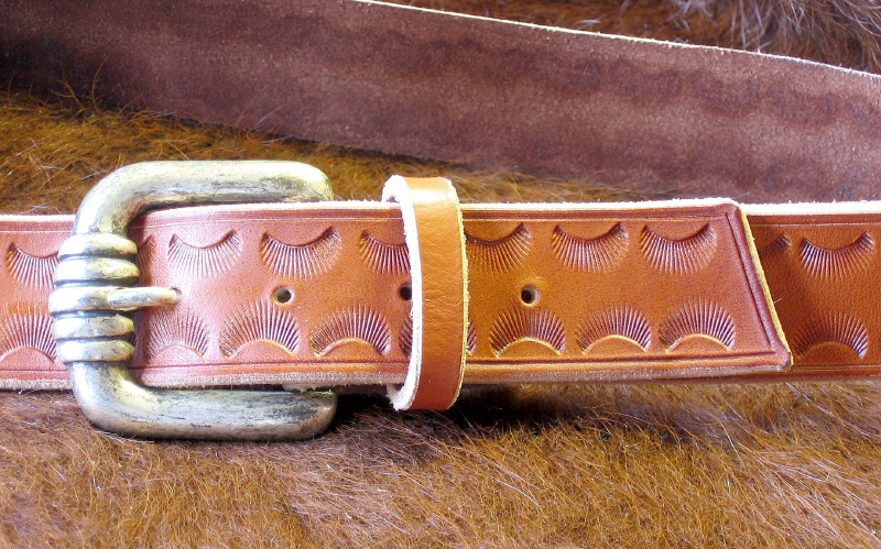 in old German Look ( rotbraun), hüftgeschnitten - also ideal für hüftige Hosen, gezogener Kante, punziertem Muschelmuschel und silberfarbener Gürtelschnalle. Breite 3,9 cm.