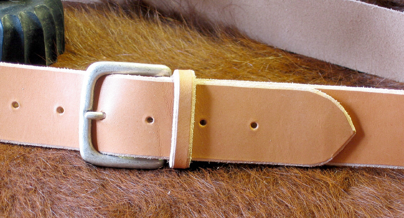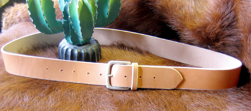 in old German hell (natur mit leicht rötlichem Touch), abgeschärfter Kante und schöner Gürtelschnalle. Breite 4 cm.