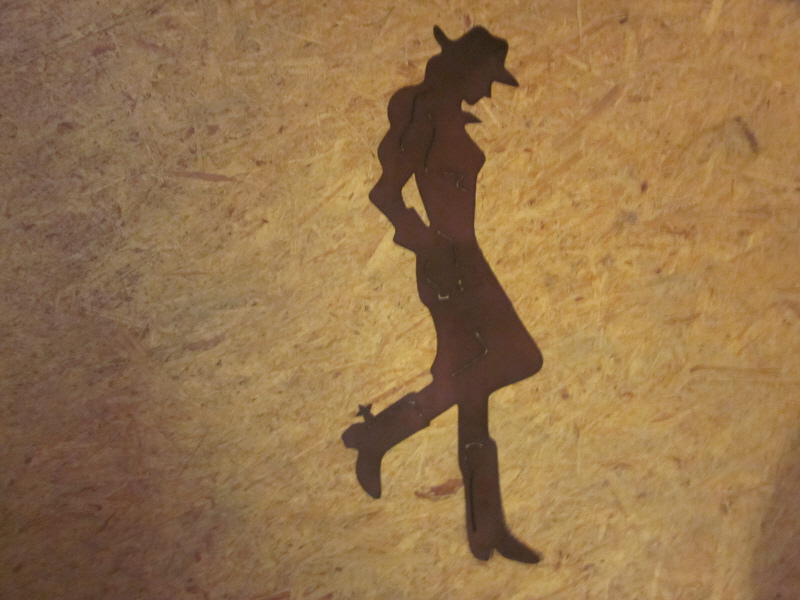 Bild aus behandeltem Metall. Mit Aufhänger auf der Rückseite. Zur Anbringung im Außen- und Innenbereich. Metallschnitt Cowgirl Größe: ca. 75,5 x 29,5 cm.