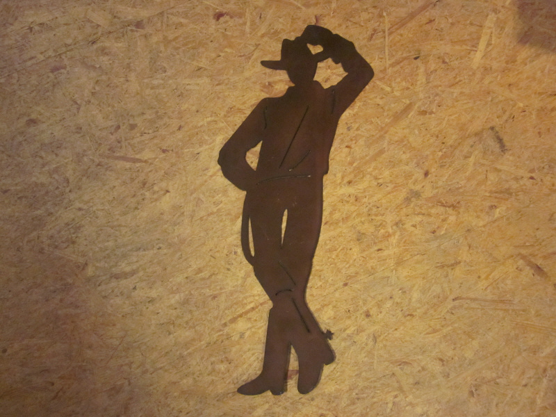 Bild aus behandeltem Metall. Mit Aufhänger auf der Rückseite. Zur Anbringung im Außen- und Innenbereich. Metallschnitt Cowboy Größe: ca. 75 x 29 cm.