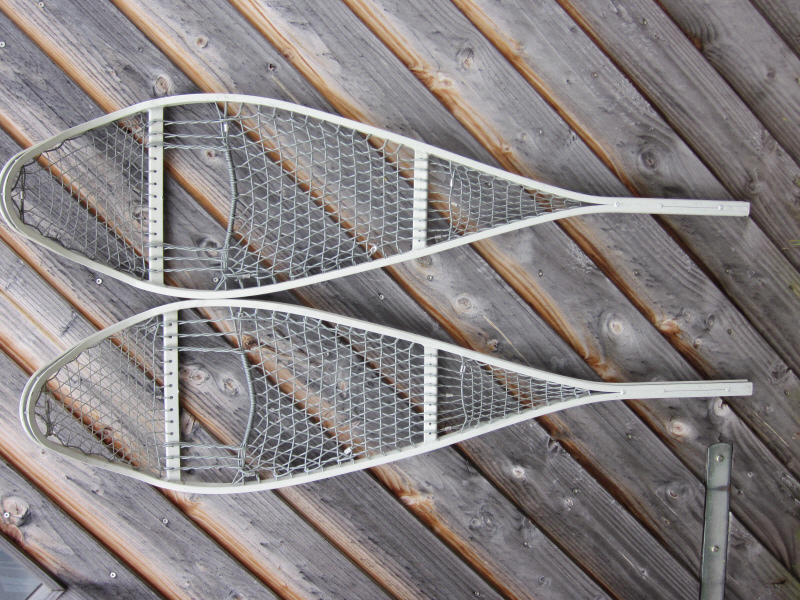 Schneeschuhe wenig gebraucht, Magnesiumrahmen mit Drahtseil bespannt, Kunststoff ummantelt ca. 1,20 x 0,30 m. Paar 79,00 €.