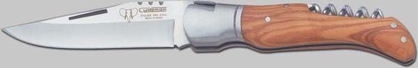 Robustes Messer in französischem Design. Mit Korkenzieher. Heftlänge 12 cm, Klinge aus 440 Stahl, rostfrei. Backen rostfrei, Griffbeschalung aus Olivenholz. Der Griff ist auch für größere Hände ausreichend bemessen.