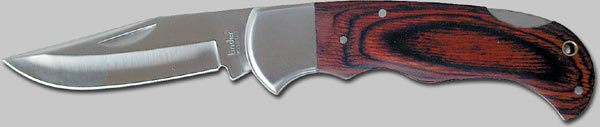 Schließmesser. Heftlänge 10 cm, Klinge aus 440 Stahl, rostfrei. Backen rostfrei, Griffbeschalung aus Pakkaholz braun.