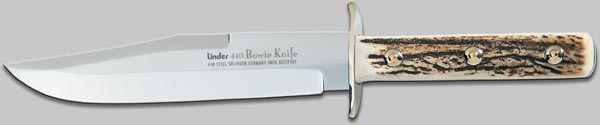Starke Bowie - Messer mit Griffschalen aus echtem Hirschhorn. Klinge aus 440A Stahl, Edelstahl-Parierelement. Starke Lederscheide mit Beinriemen. Klinge 15 cm.