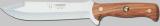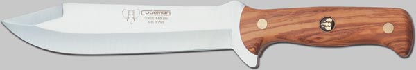 Bowie mit Griffschalen aus Olivenholz. Klinge aus 440A Stahl, rostfrei. Lederscheide, Klinge 20 cm.