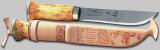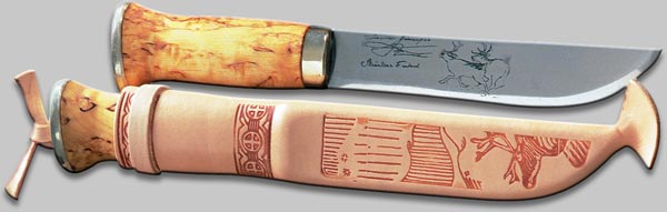 Lappland-Messer mit Klinge aus Carbonstahl mit Klingenätzung. Griff aus Maserbirke, Metallteile aus Neusilber. In Lederscheide mit Motivprägung. Klinge 18 cm.