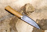 handgearbeitet im Schwäbischen, Klingenlänge: 120mm, flacher Schliff. Klingenstahl: Kugellagerstahl, Härte in HRC: 58, Gewicht: 112g, Griffmaterial aus Ulme, Beschläge aus Messing.