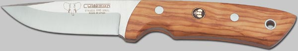 Jagdmesser mit 440 Stahl Klinge, rostfrei, Griffschalen aus fein gemasertem Olivenholz. Klingenlänge 9 cm mit Lederscheide