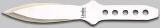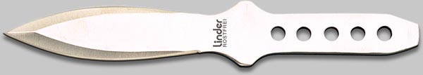 Rostfreies Wurfmesser, mit gelochtem Griff, satiniert. In Spezial-Scheiden. Gesamtlänge 17 cm